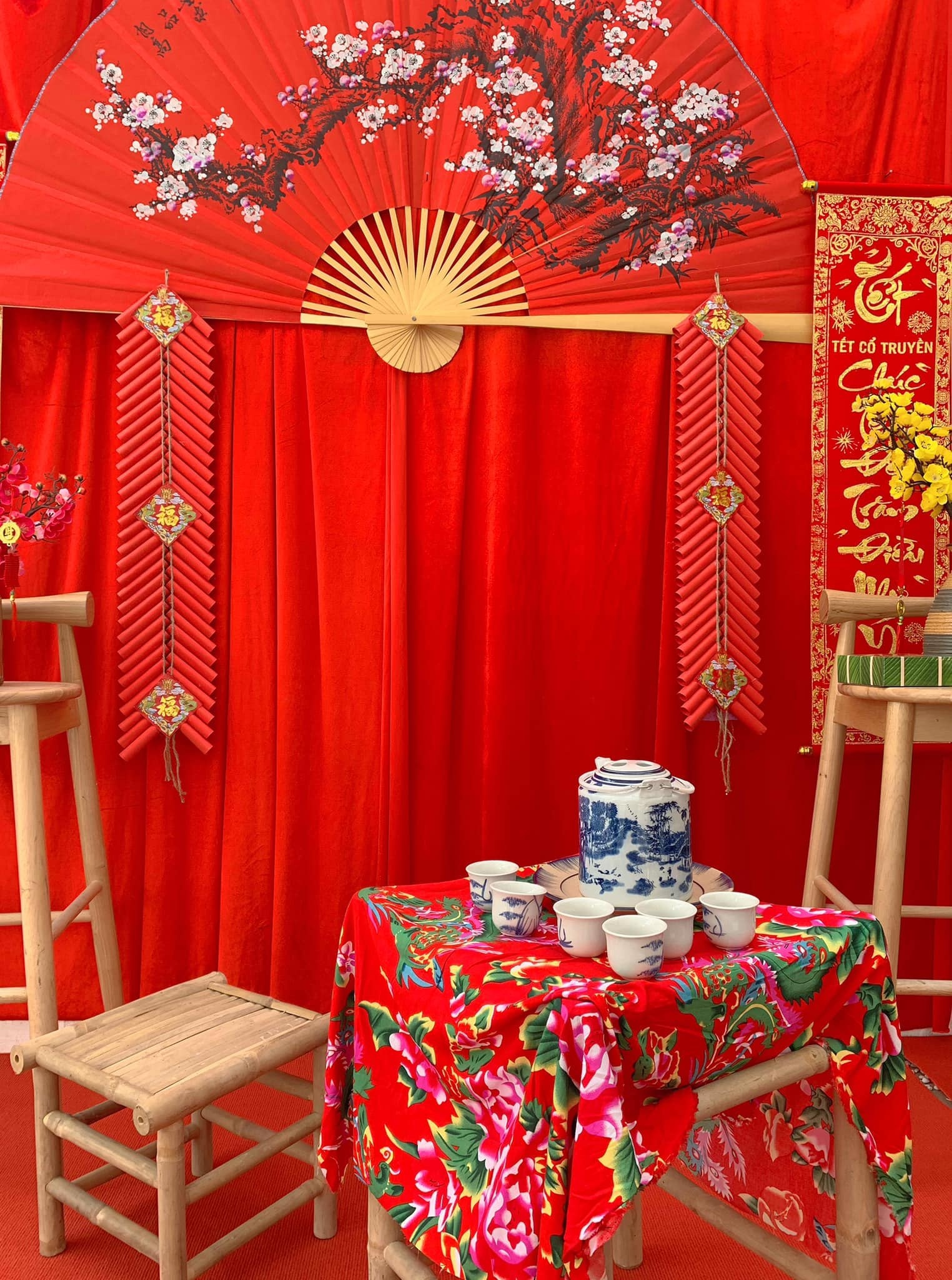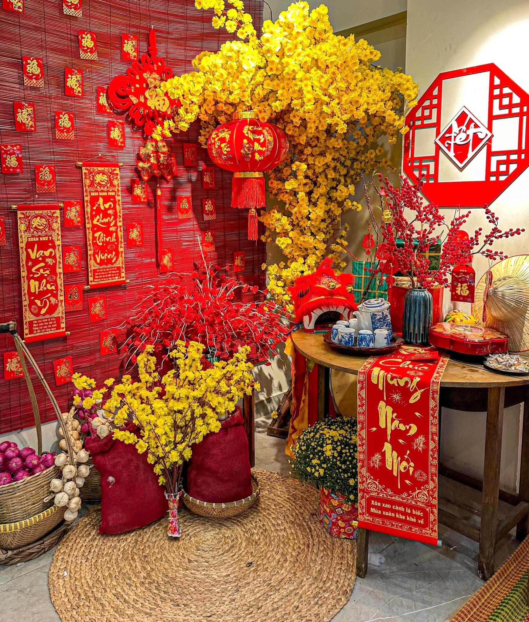 Để chào đón dịp Tết Nguyên đán, quán như khoác thêm áo mới với nhiều góc chụp hình đậm chất lễ hội. Tone đỏ ngự trị từ phông nền, dải pháo, câu đối, quạt trang trí đan xen chậu cúc, hoa mai là điểm nhấn gợi cảm hứng chụp hình cho khách ghé đến.