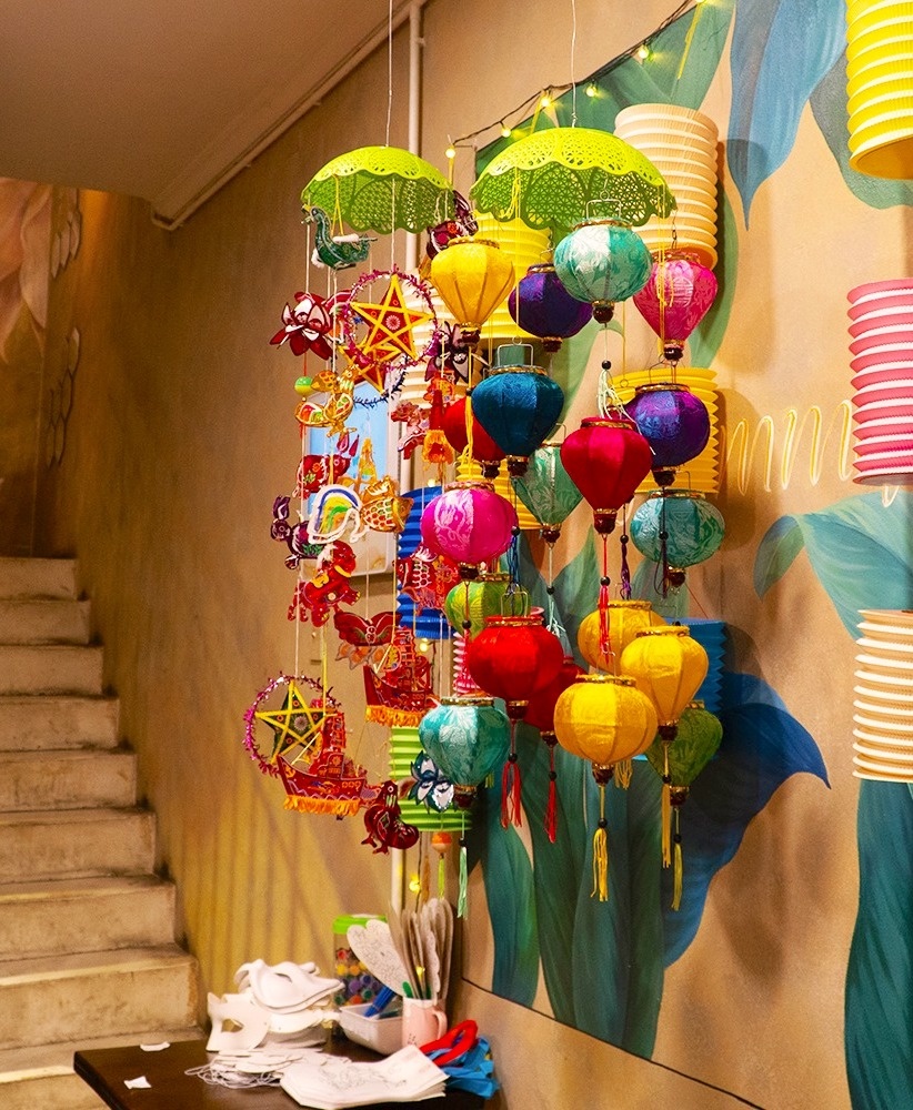 - Dịp Trung thu, tiệm thêm lung linh nhờ đèn lồng đa sắc màu. Tại đây, bạn cũng có cơ hội trải nghiệm tự tay làm ra những chiếc mặt nạ giấy bồi thủ công hoặc được tặng bánh trứng chảy hay lồng đèn giấy với hóa đơn đủ điều kiện.
