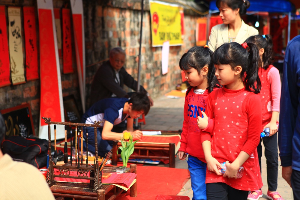 | Hai em bé được người lớn cho đi tham quan và xin chữ về treo. |