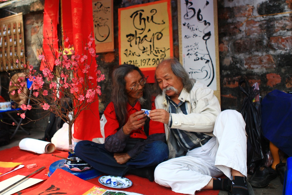 | Ông đồ Văn Thùy (trái) nghỉ tay tiếp người bạn già chén rượu chiều cuối năm. |
