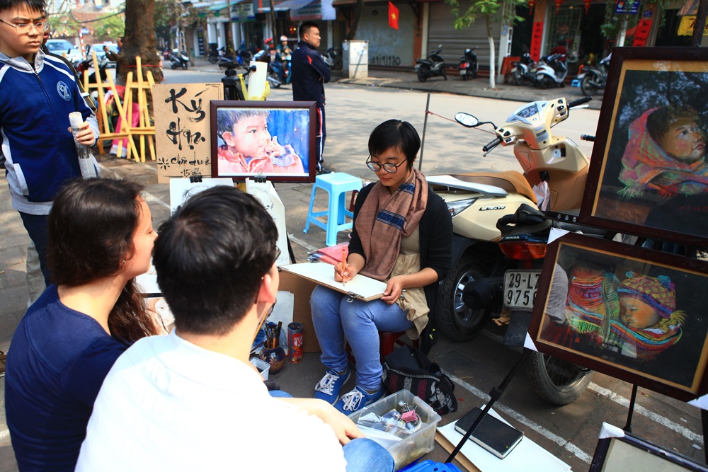| Một số người thảnh thơi ngồi chờ họa sĩ vẽ chân dung mình. |