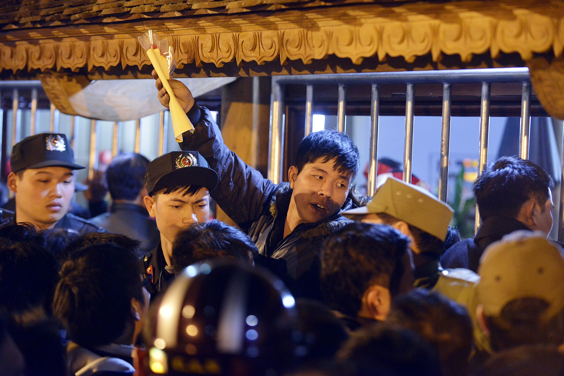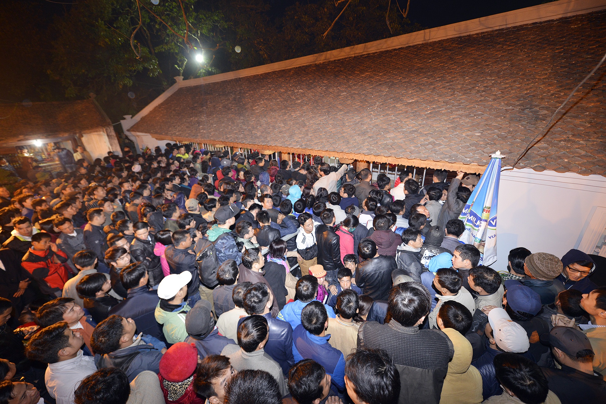 | Cảnh tượng hỗn loạn, chen chúc tại đền Thiên Trường trước giờ phát ấn. |