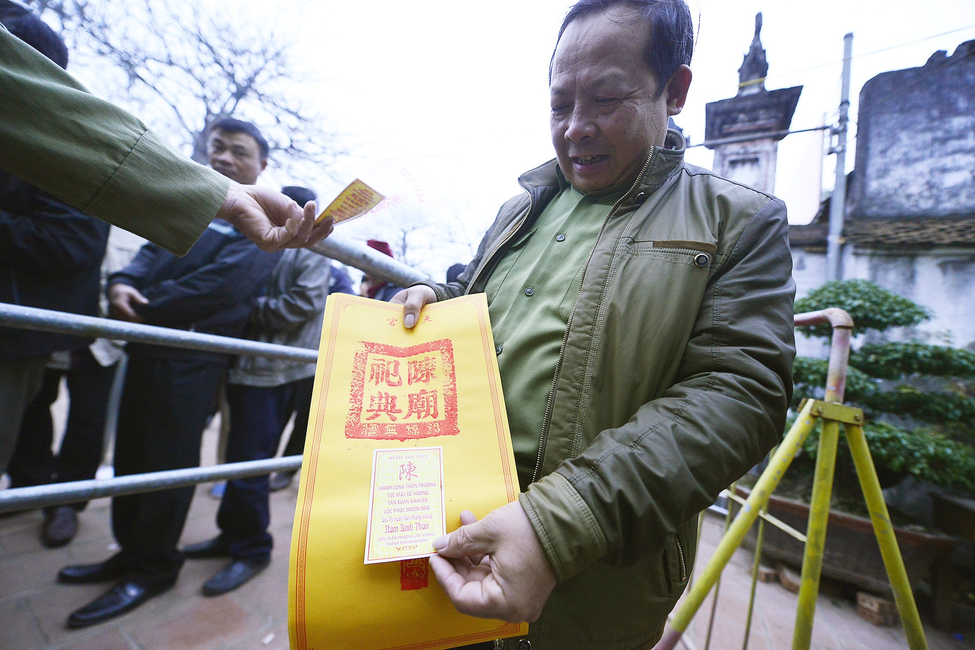 | Ông Hà (ở phường Lộc Vượng, Nam Định) tỏ ra hài lòng dù xếp hàng khá lâu mới mua được ấn. |