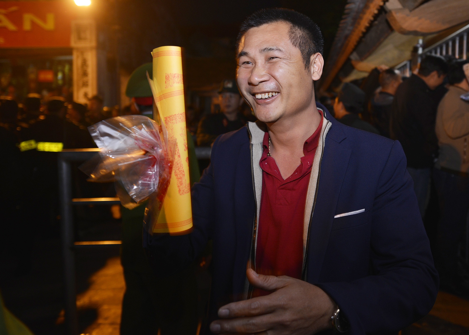 | Anh Tiên may mắn là một trong những khách đầu tiên mua được ấn. Anh cho biết, hầu như năm nào cũng về đây làm công việc này, cầu cho gia đình có sức khoẻ và công danh thành đạt. |