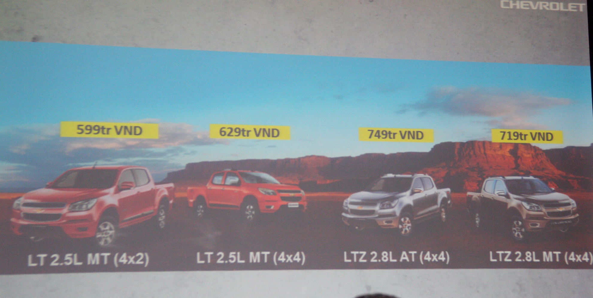 Chevrolet Colorado với 4 phiên bản mới gồm LT 2.5L MT một cầu, LT 2.5L MT hai cầu, LTZ 2.8L AT hai cầu và LTZ 2.8L MT hai cầu, có giá bán lần lượt là 599 triệu, 629 triệu, 749 triệu và 719 triệu đồng.