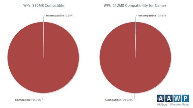 Hai biểu đồ tròn dưới đây cho thấy có 0,361% game không tương thích với các thiết bị có RAM từ 512MB trở xuống. Đây là tin tốt cho người dùng có ý định sử dụng điện thoại chạy Windows Phone tầm trung và không có cấu hình mạnh.