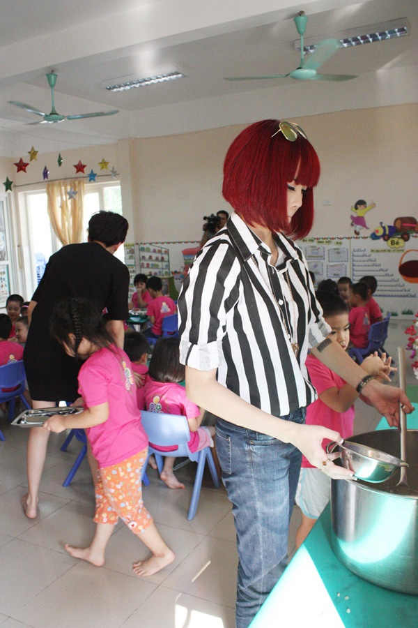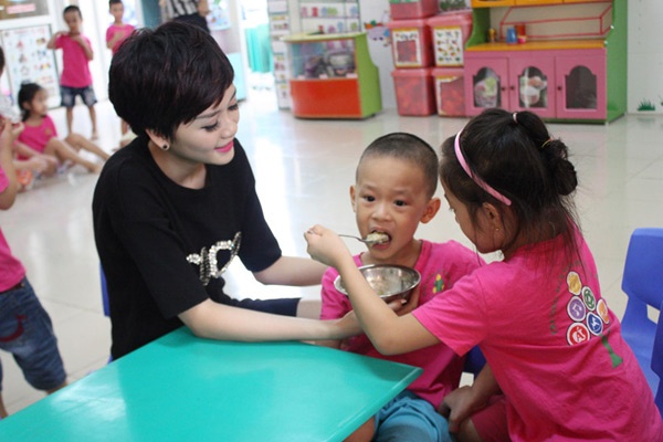 | Bảo Trâm ân cần “dụ dỗ” một thiên thần nhí ăn hết phần của mình. |