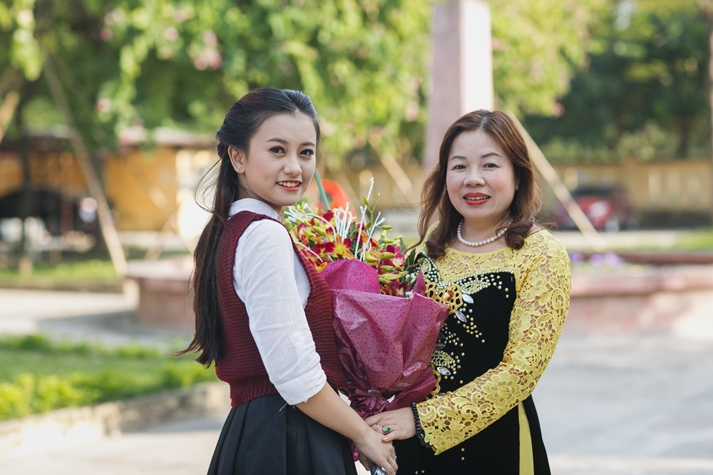 | Quỳnh trao bó hoa tươi thắm đến cô giáo chủ nhiệm Nguyễn Thị Mai, đang công tác tại trường THPT Tây Hồ, Hà Nội. Khoảnh khắc rạng rỡ của hai cô trò trước ống kính. |