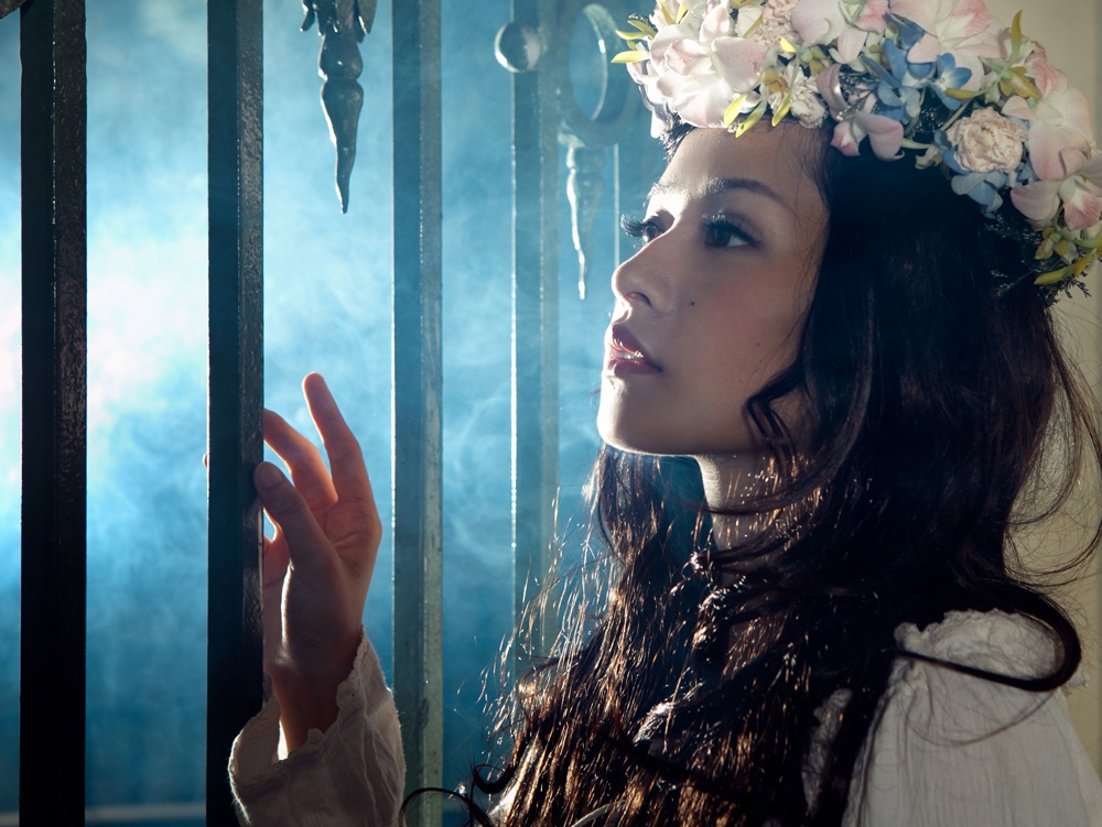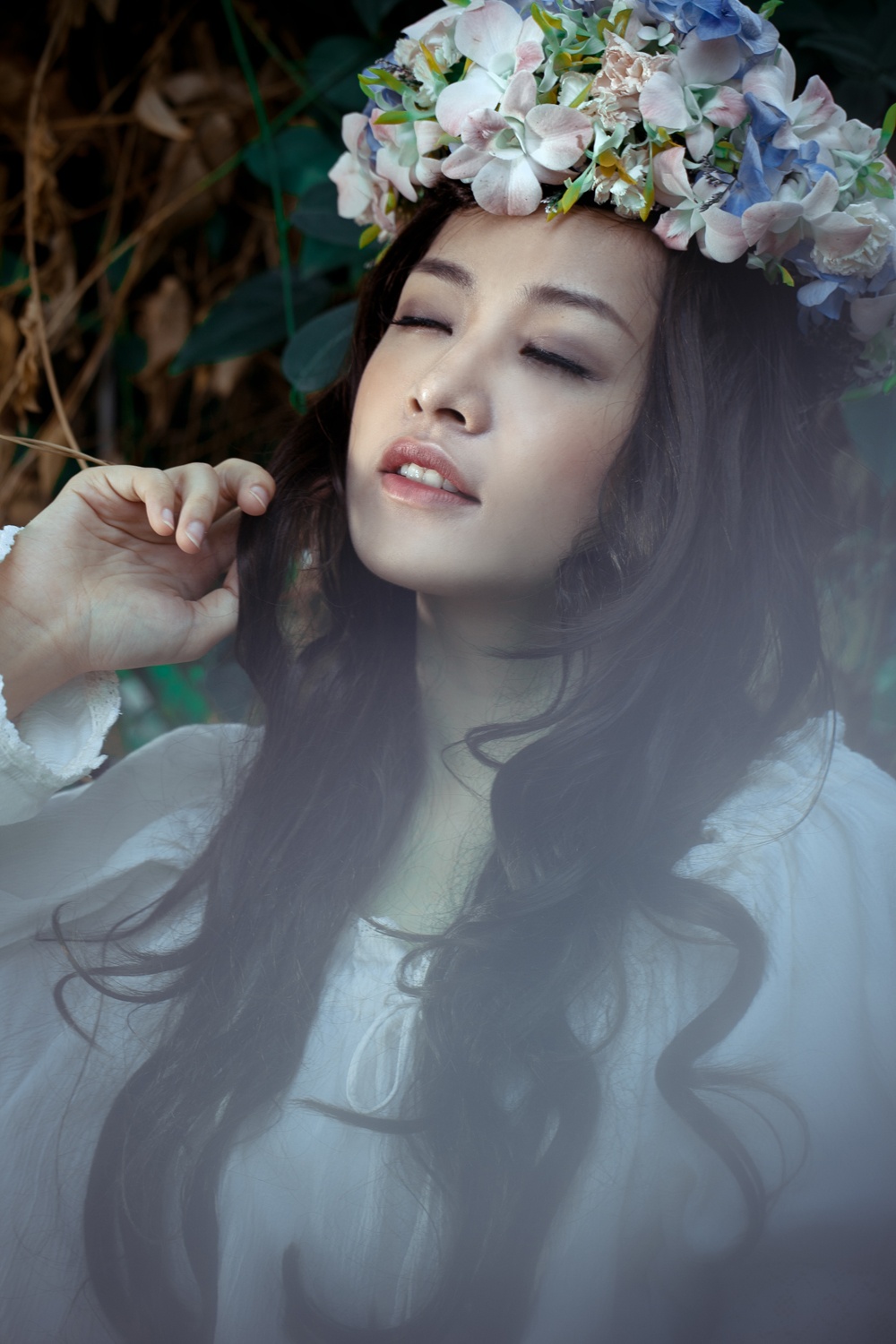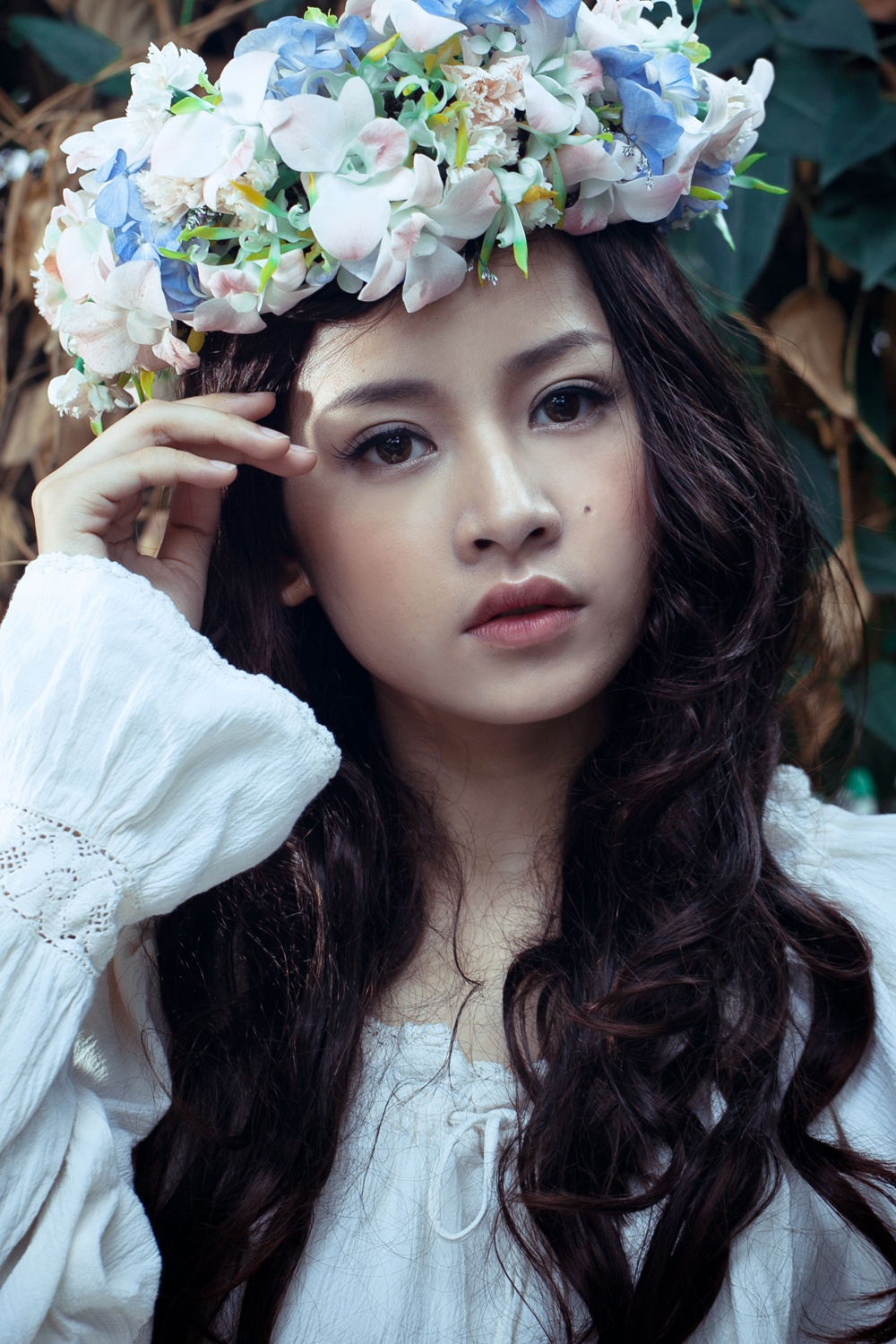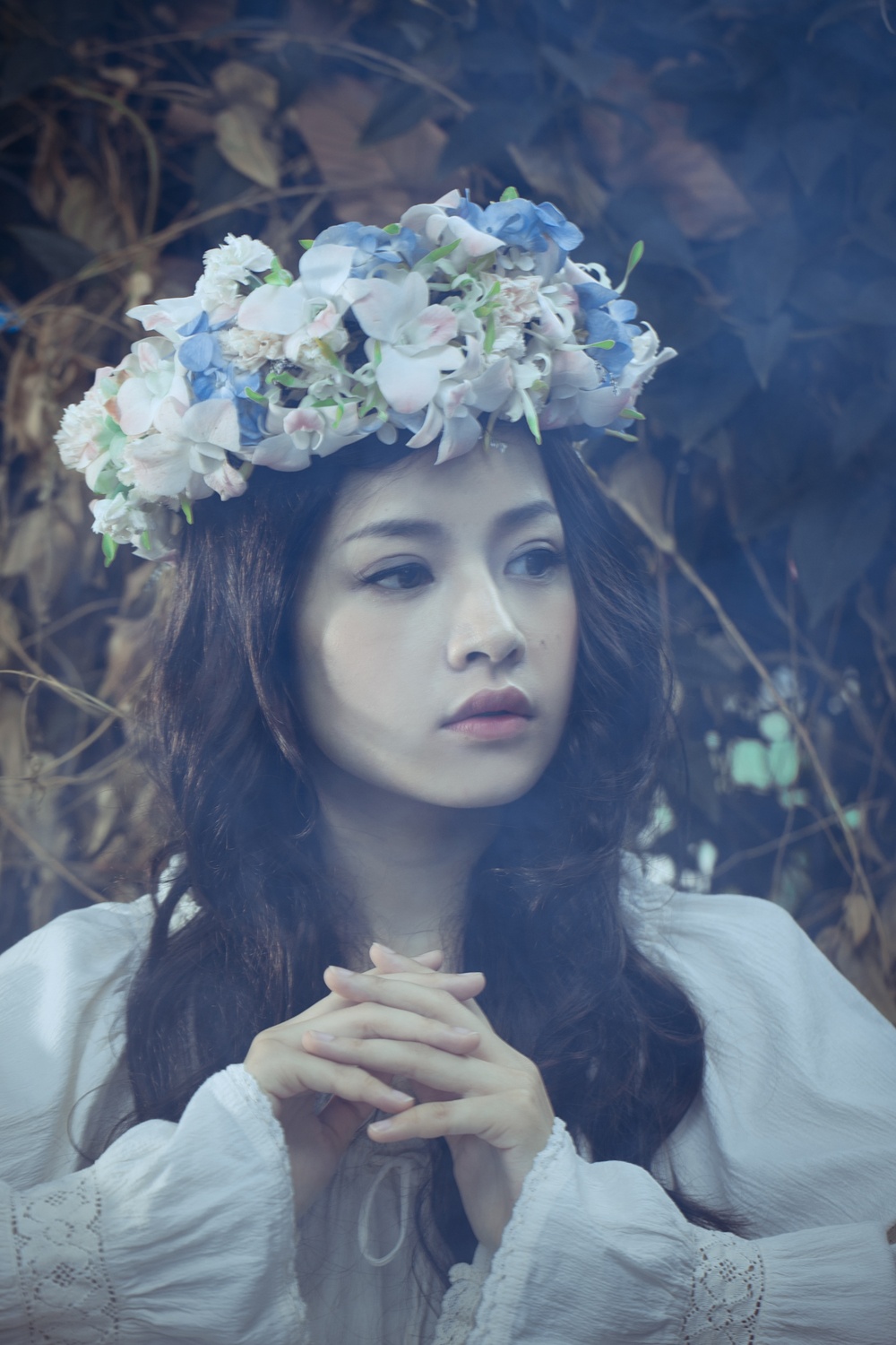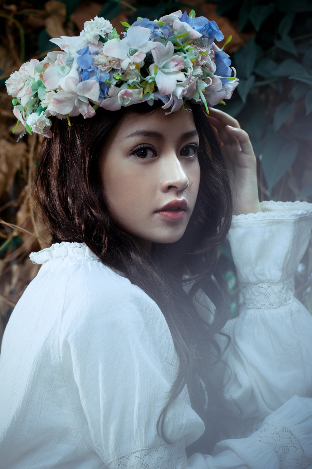 Một Chi Pu nhẹ nhàng và quyến rũ mang phong cách châu Âu với vòng hoa kết trên đầu và chiếc váy trắng tinh khiết.