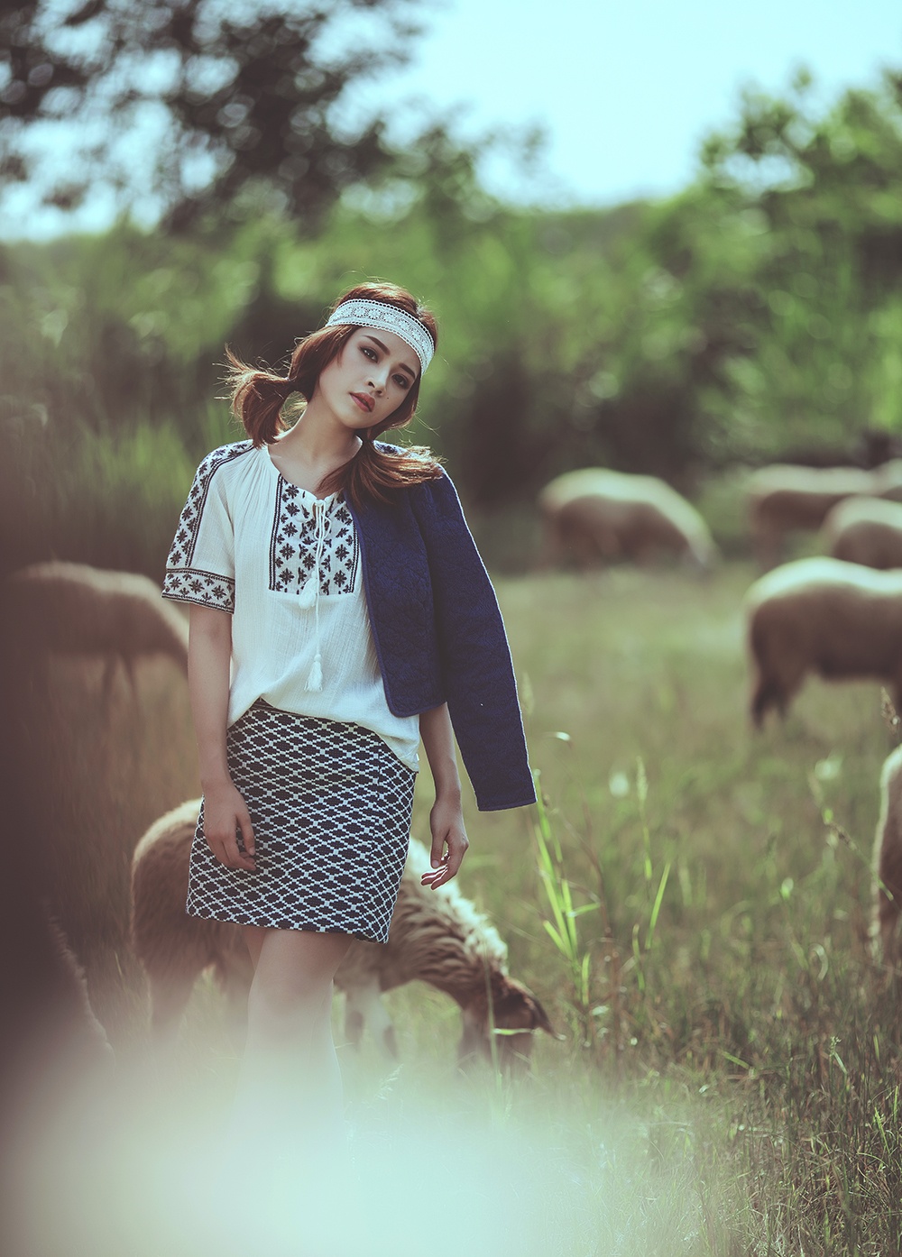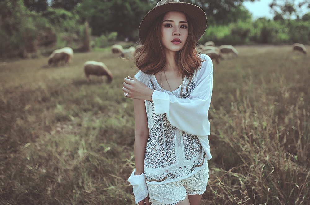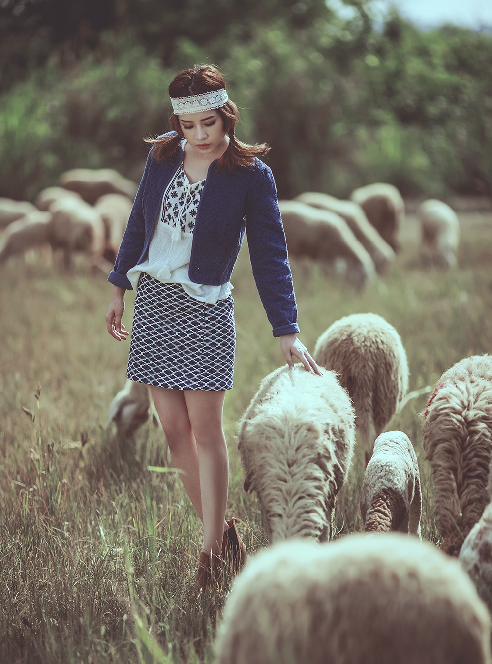 | Để đi sát với chủ đề, Chi Pu và ê-kíp đã chọn Biên Hòa làm điểm chụp ảnh. Nữ diễn viên không ngại vất vả tạo dáng trên đồng cỏ đầy nắng. "Bạn diễn" là các chú cừu đã giúp bộ ảnh thêm sinh động. |