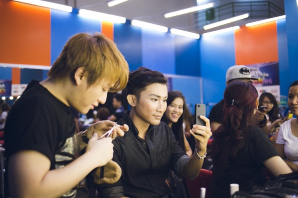 | Chí Thiện tranh thủ chụp ảnh tự sướng post lên trang cá nhân trong khi make up. |