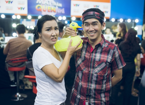 | Minh Thuận và Ngân Quỳnh phấn khích chụp ảnh cùng với đạo cụ là chú vịt trong hậu trường. |