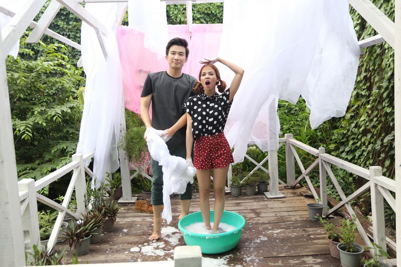 | Hình ảnh anh giúp cô bạn gái giặt đồ ở sân phơi khiến trong MV khiến các fan nữ thích thú. |