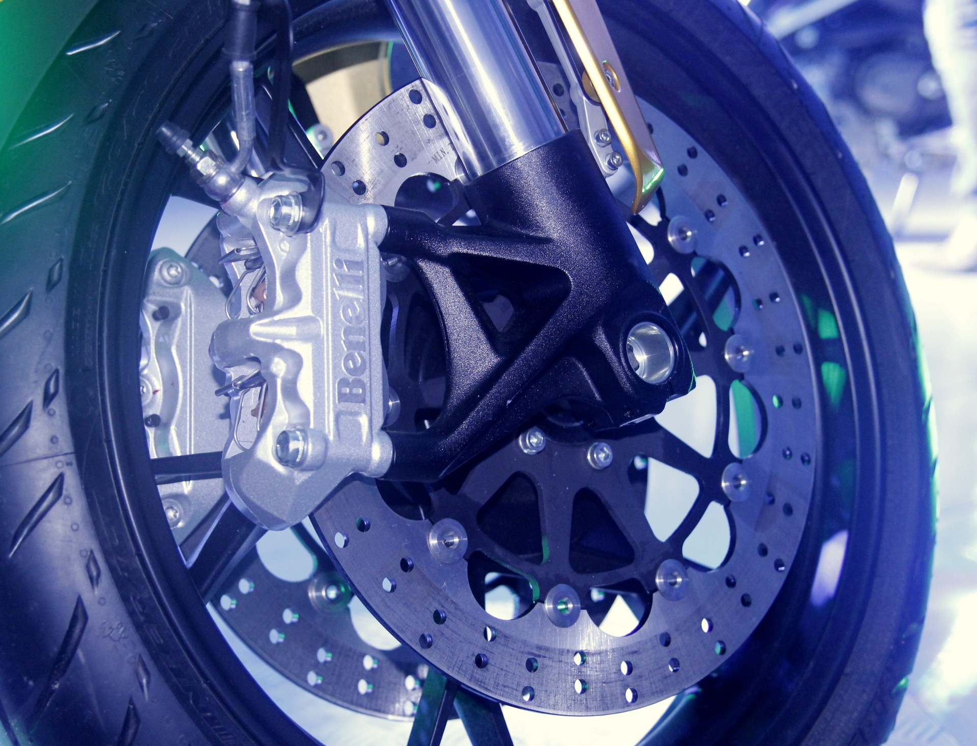 | Cụm đèn pha kép phía trước được đặt trên/dưới nhằm tăng cường độ sáng. Xe sử dụng cặp phuộc ngược. |