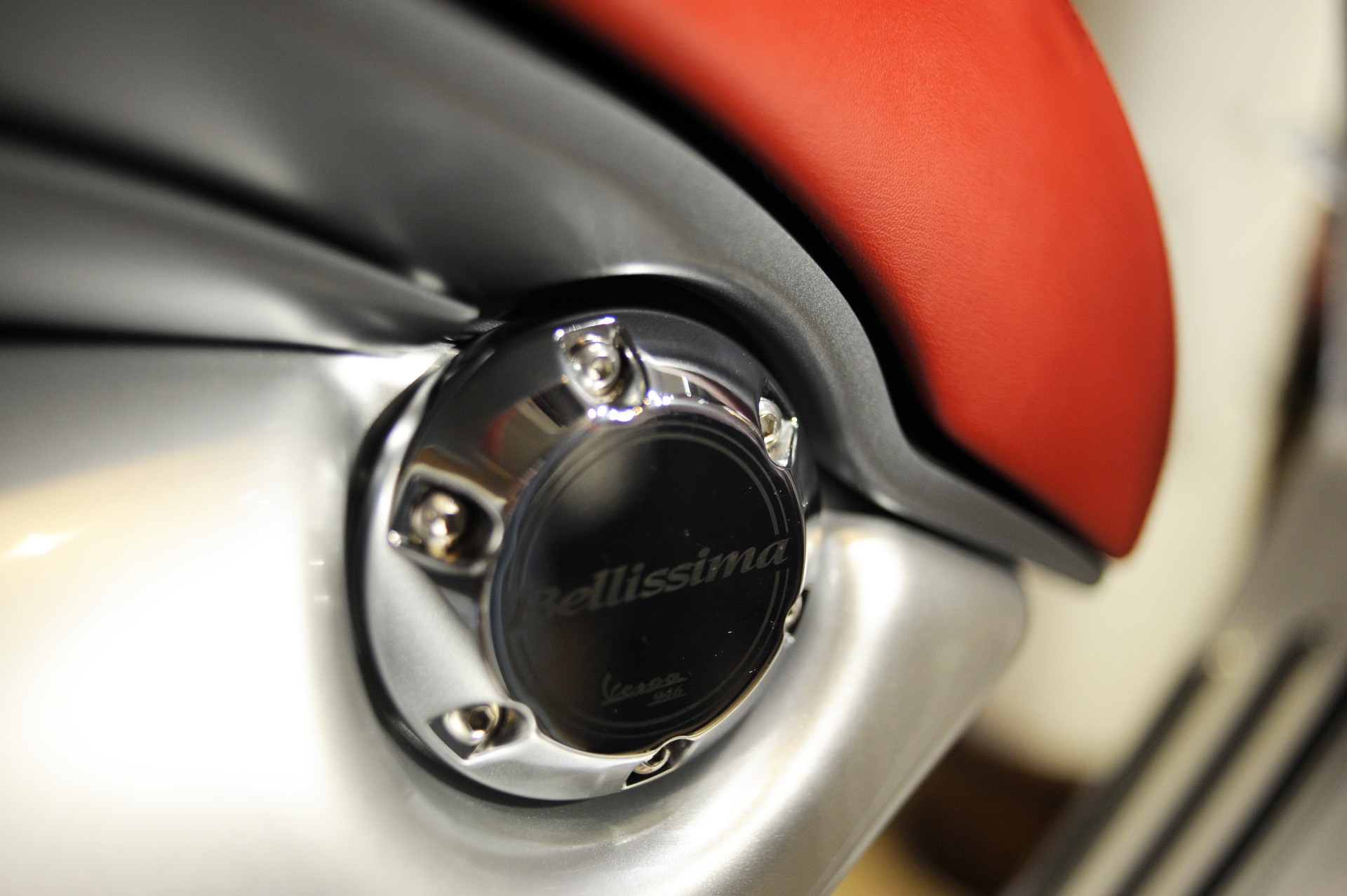 | Dòng chữ Bellissima được in trên tấm ốp bản lề nối thân xe và yên xe. |