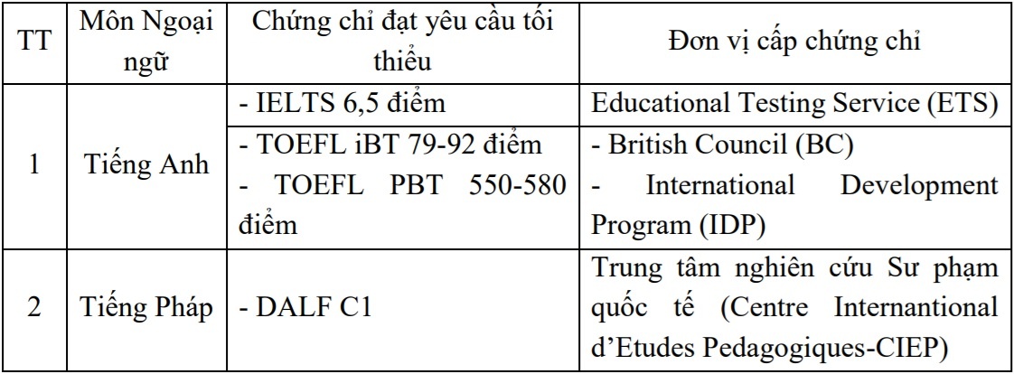 Với phương thức xét tuyển kết hợp, thí sinh phải có chứng chỉ tiếng Anh hoặc tiếng Pháp quốc tế hợp lệ, có giá trị sử dụng ít nhất đến ngày nộp hồ sơ (dự kiến trước 15/6) và đạt mức điểm tốt thiểu theo bảng dưới đây: