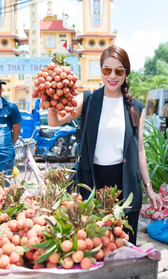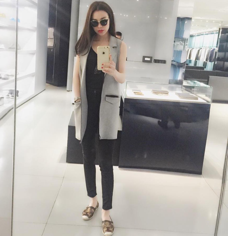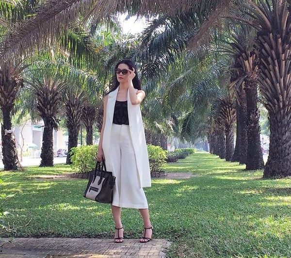 | Trương Ngọc Ánh xuống phố với cây đen trắng và áo gile trẻ trung. |