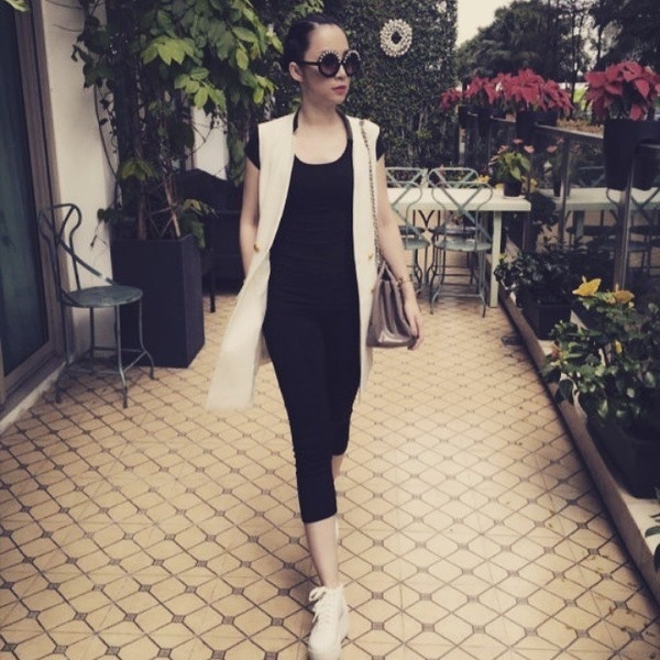 | Một lựa chọn của Linh Nga khá giống Thùy Dung nhưng khỏe khoắn hơn nhờ giày vải và quần ôm sát. |