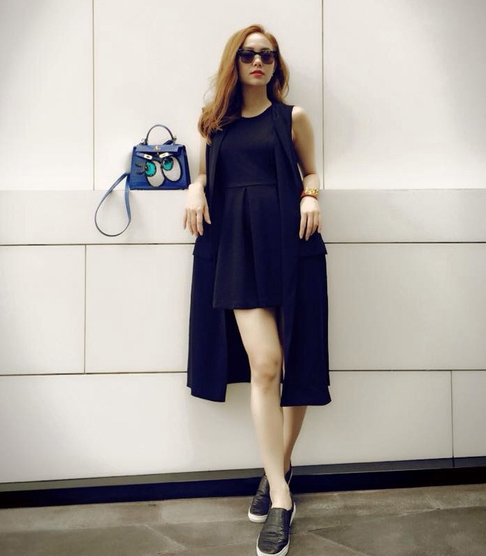 | Minh Hằng lựa chọn áo gile đen khi mix kèm váy xòe. |