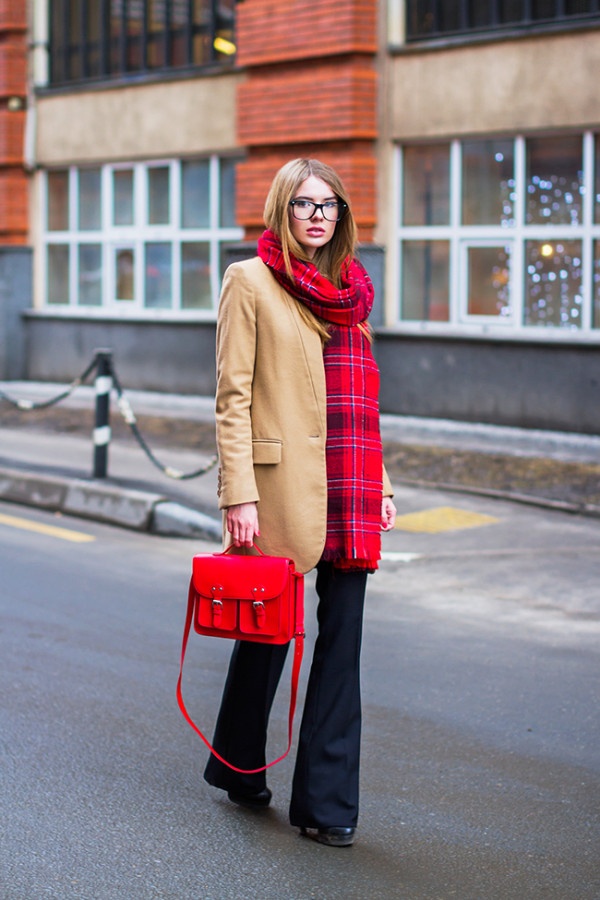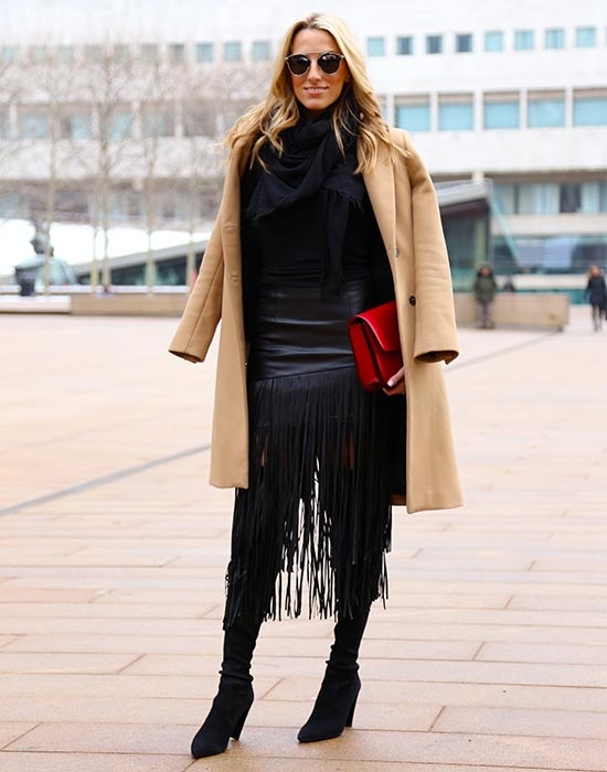 | Thời trang sang chảnh với đầm đỏ và áo khoác dạ. |