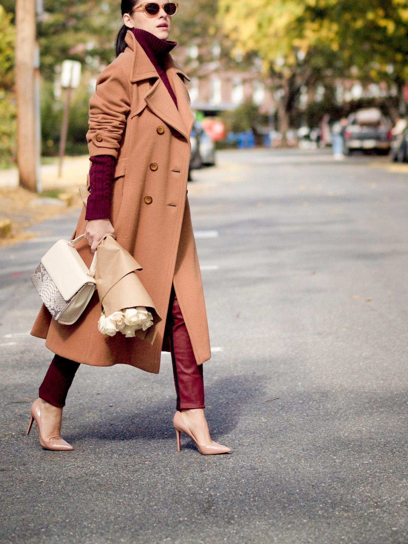 | Kết hợp áo khoác camel với tông màu đỏ mận sang trọng và lịch lãm. |