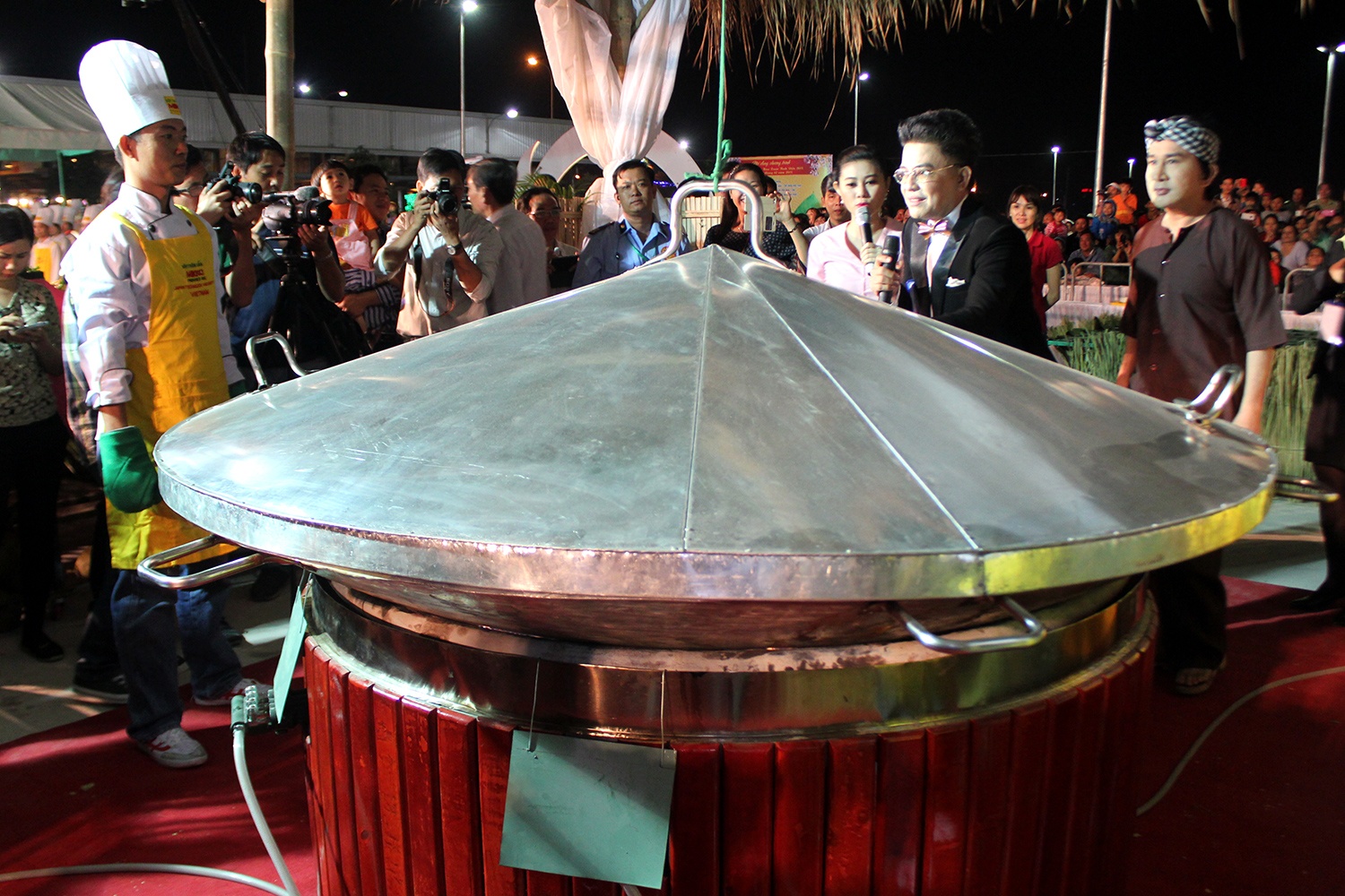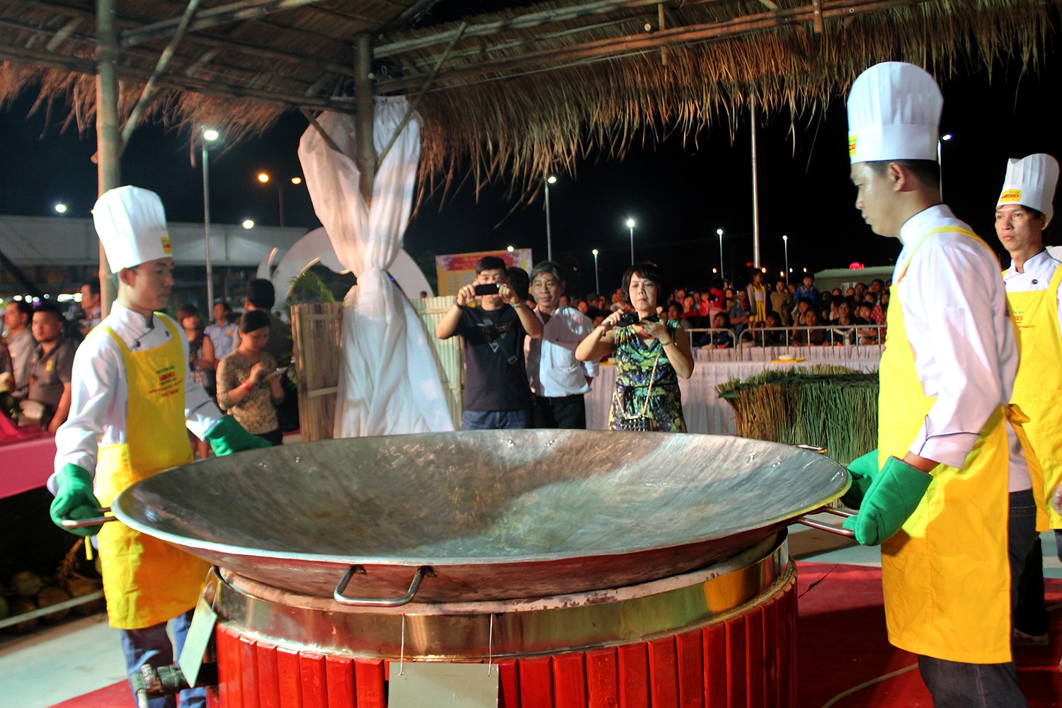 | Riêng chiếc chảo khủng có đường kính hơn 2m, nặng đến 35 kg, và có đến 4 chiếc quai, cần 4 đầu bếp mới vận hành. |