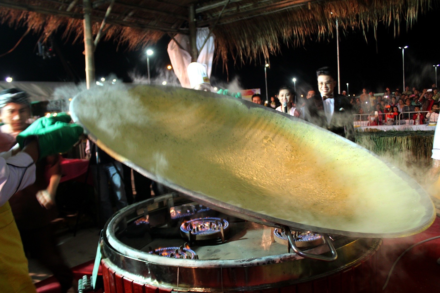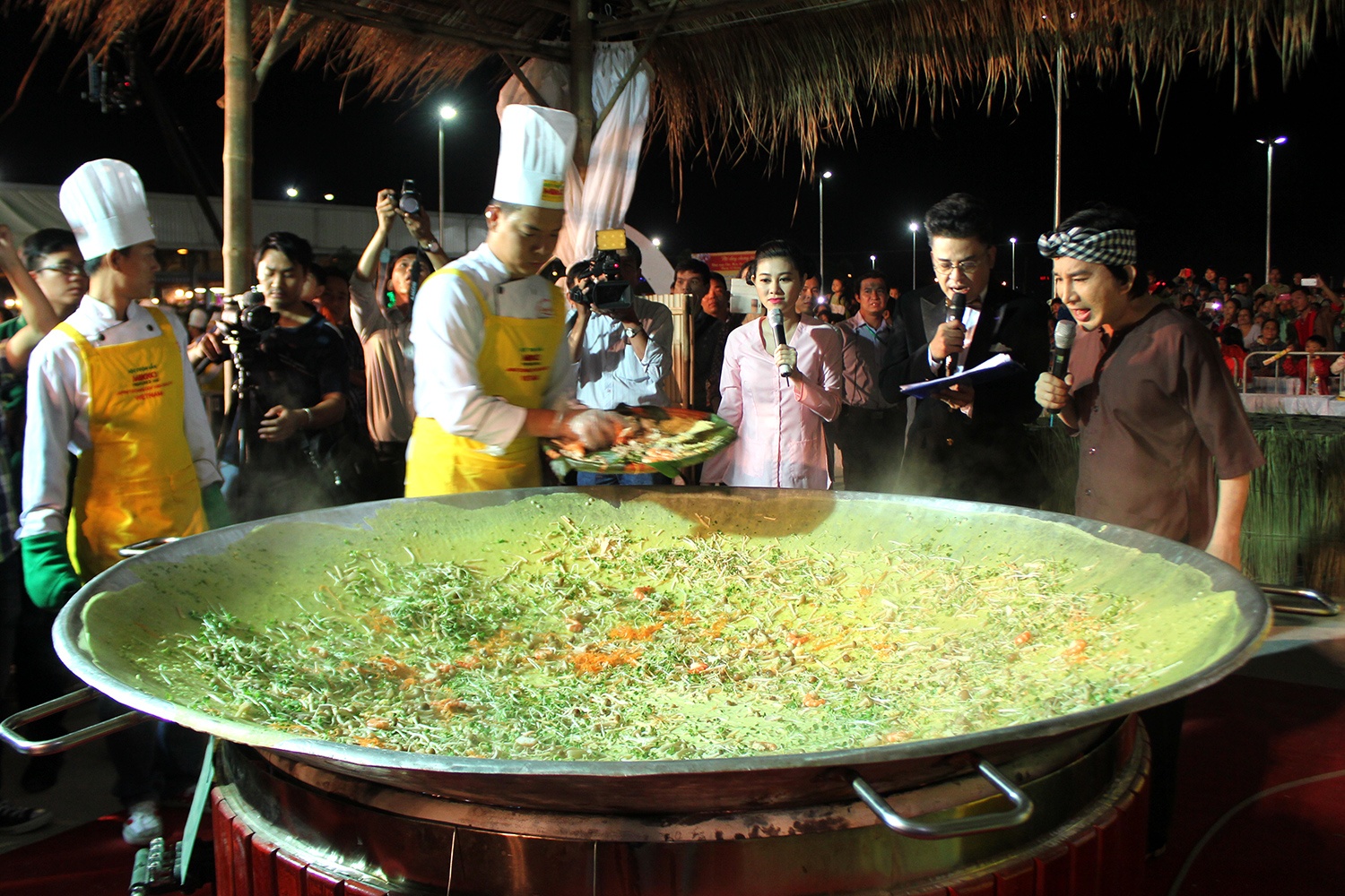 | Ngoài chiếc bánh xèo lớn nhất, đơn vị tổ chức cũng lập luôn kỷ lục Nhiều người cùng đổ bánh xèo nhất, với số lượng lên đến 40 người. |