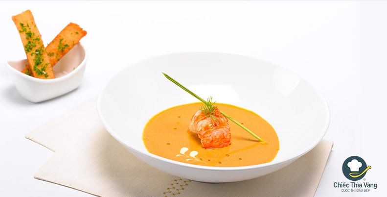 Món súp kem béo tôm hùm đặc biệt ăn kèm với bánh mì bơ tỏi nướng. |