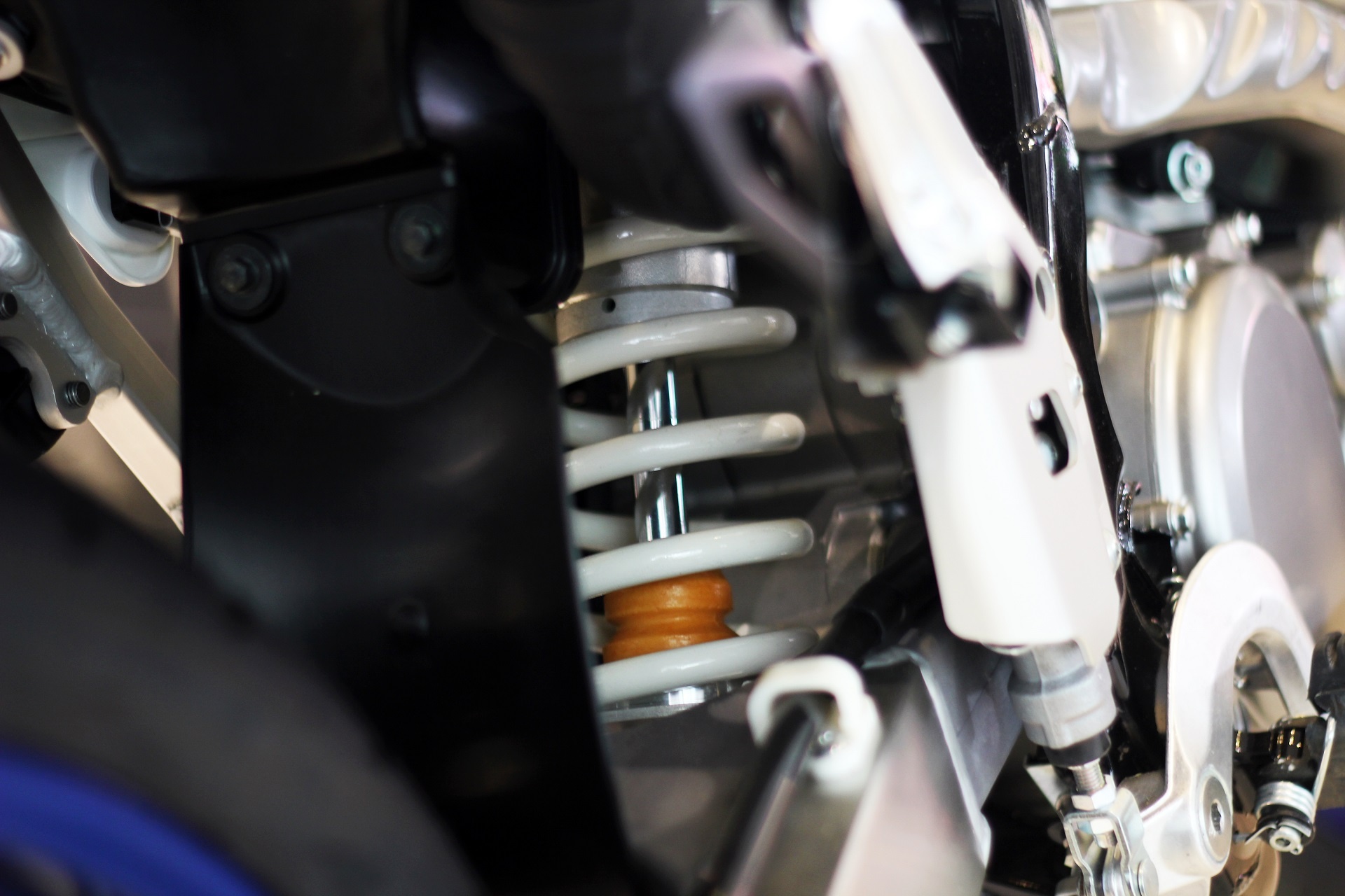 Hệ thống giảm chấn phía trước được trang bị cặp phuộc ngược, hành trình dài, có thể điều chỉnh độ nén, giảm sốc phục hồi và phủ một lớp alumite bên trong xy-lanh cho cảm giác nhún khá trơn tru.