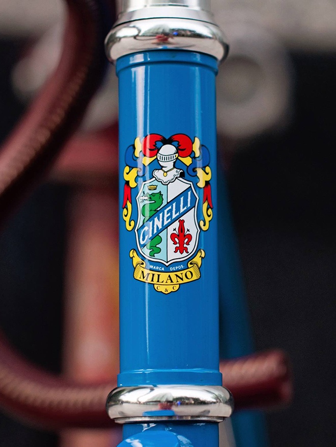 | Logo hãng Cinelli được in nổi bật trên cổ xe. |