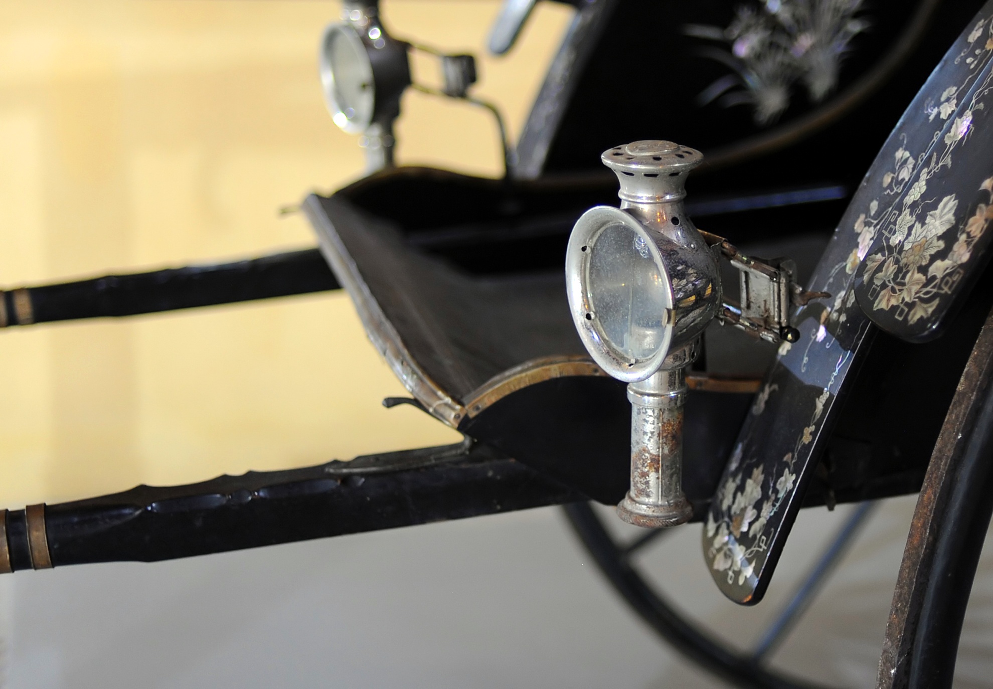 Các bộ phận của xe kéo như càng xe được trang trí bằng vòng bằng kim loại màu trắng, mui được gắn ống đồng.