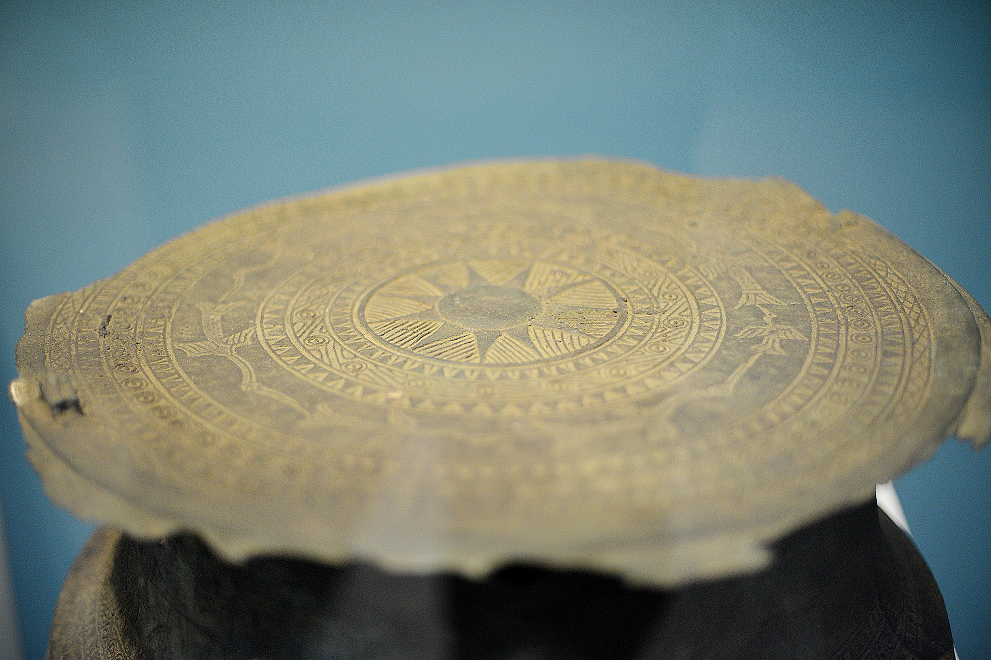 | Hoa văn tinh xảo trên mặt trống đồng phát hiện tại Cốc Lếu, Lào Cai. |