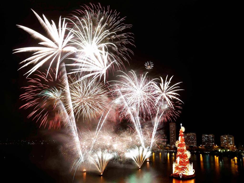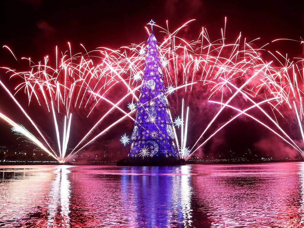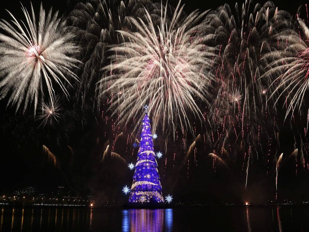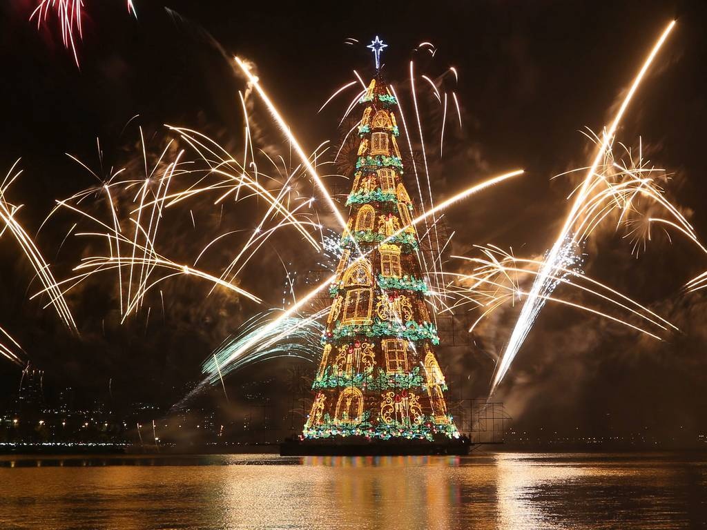 | Cây thông Noel nổi lớn nhất thế giới và pháo hoa rực sáng trời đêm thành phố Rio de Janeiro. Ảnh: AP |
