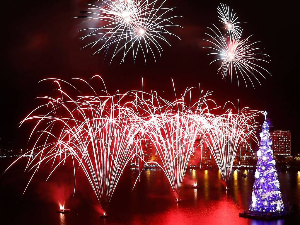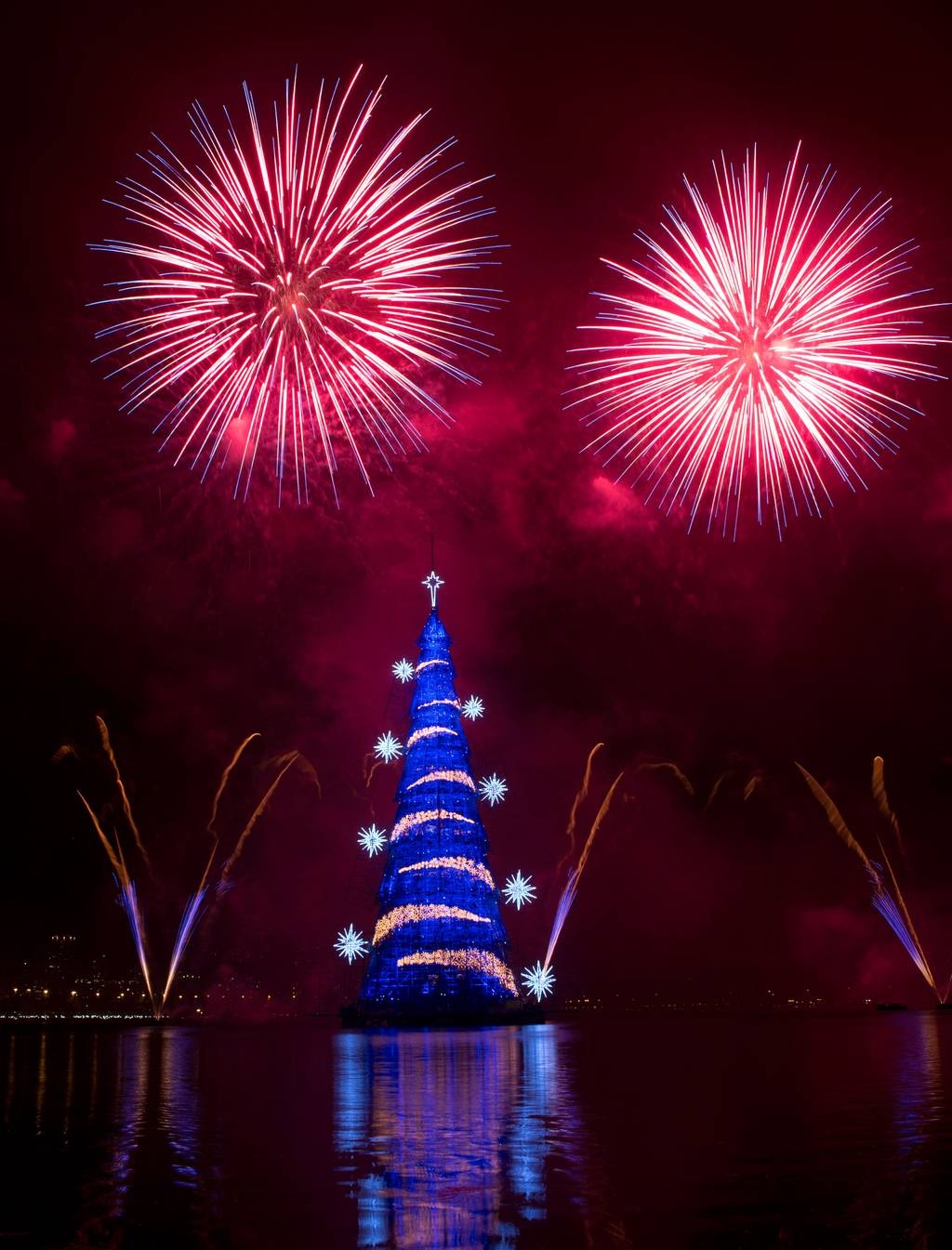 | Cây thông chuyển màu liên tục trên nền màn pháo hoa rực rỡ. Ảnh: EPA |