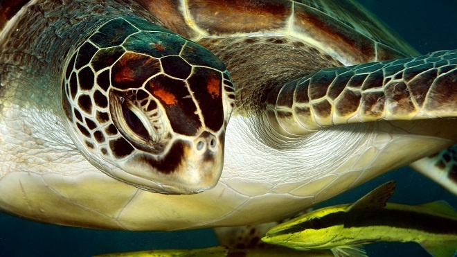 | Con đồi mồi đang nhìn về phía con cá ép. |