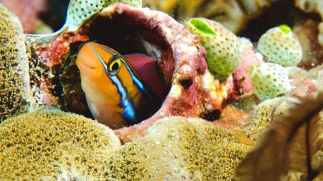 | Chú cá lon sọc xanh ẩn trong những rạn san hô. |