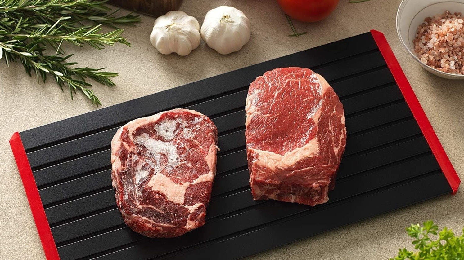 Kẹp miếng thịt giữa các vật dụng kim loại có bề mặt phẳng (như nồi, chảo) hoặc dùng dụng cụ rã đông chuyên dụng để rút ngắn thời gian làm bếp.