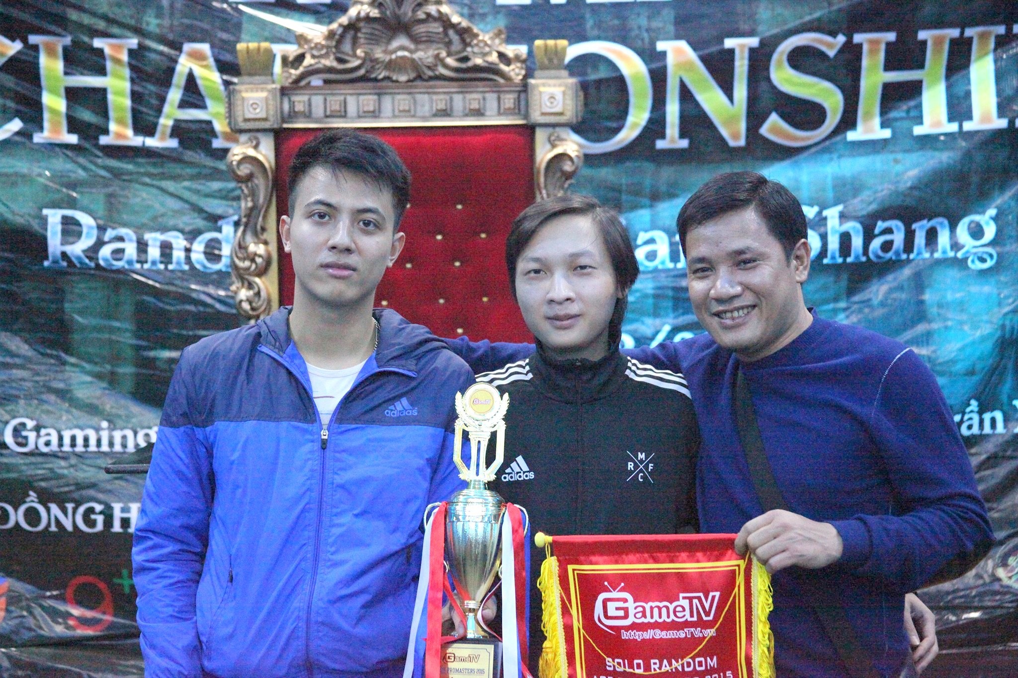 | Hoàng Mai Nhi (giữa) hạnh phúc với chiếc cup vô địch. Bên trái là Á quân của trận đấu đầu tiên - game thủ Tý. |