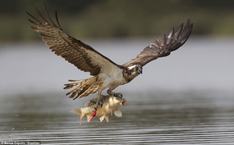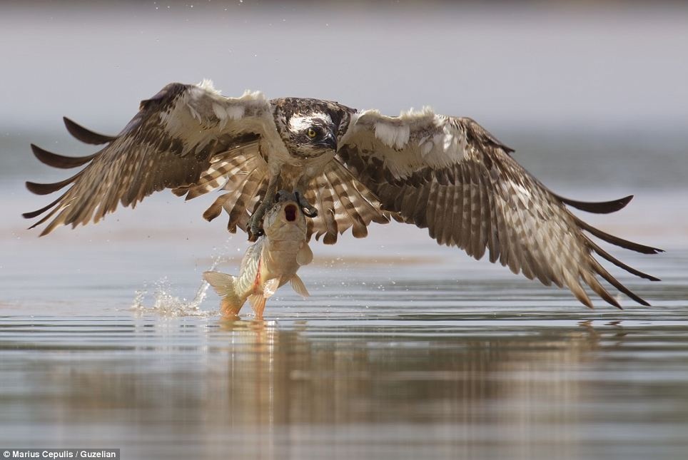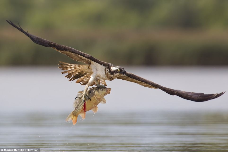 | "Con cá lớn đến nỗi chim ưng mất vài giây để lấy lại tư thế thăng bằng và giữ chặt con mồi", Marius kể. |