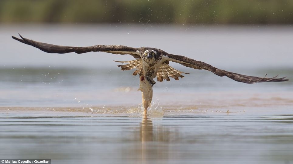 | Để chụp cảnh tượng này, nhiếp ảnh gia Marius Cepulis phải nấp trong đám sậy ở ven hồ trong gần ba giờ. Đúng lúc Marius định rời đám sậy trong tâm trạng thất vọng thì con chim ưng biển xuất hiện. |