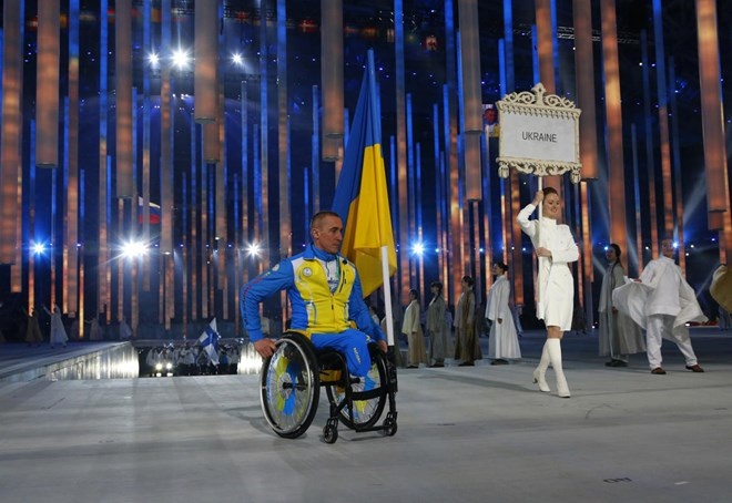 | Vận động viên Mykhaylo Tkachenko của đoàn Ukraina nhận được sự hò reo cổ vũ từ khán đài sân vận động Fisht trong lễ khai mạc Paralympics mùa đông 2014. Ảnh: AFP. |