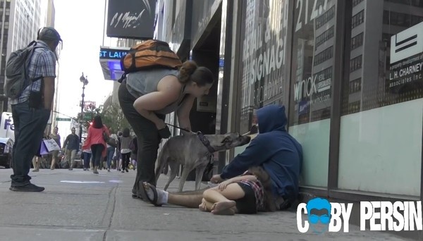 | Chỉ có người phụ nữ vô gia cư dừng chân cho tiền hai "bố con" trên đường phố New York. |