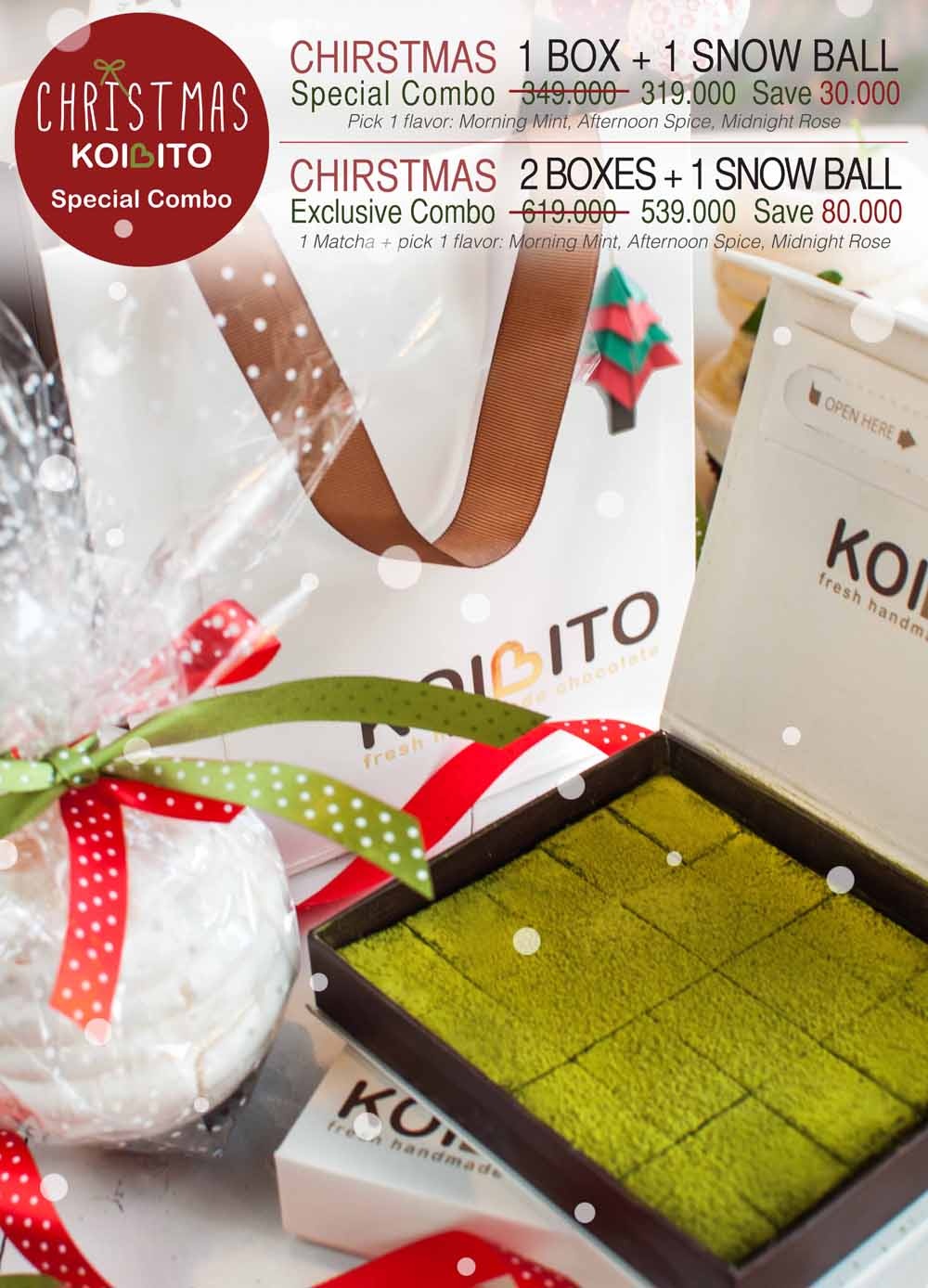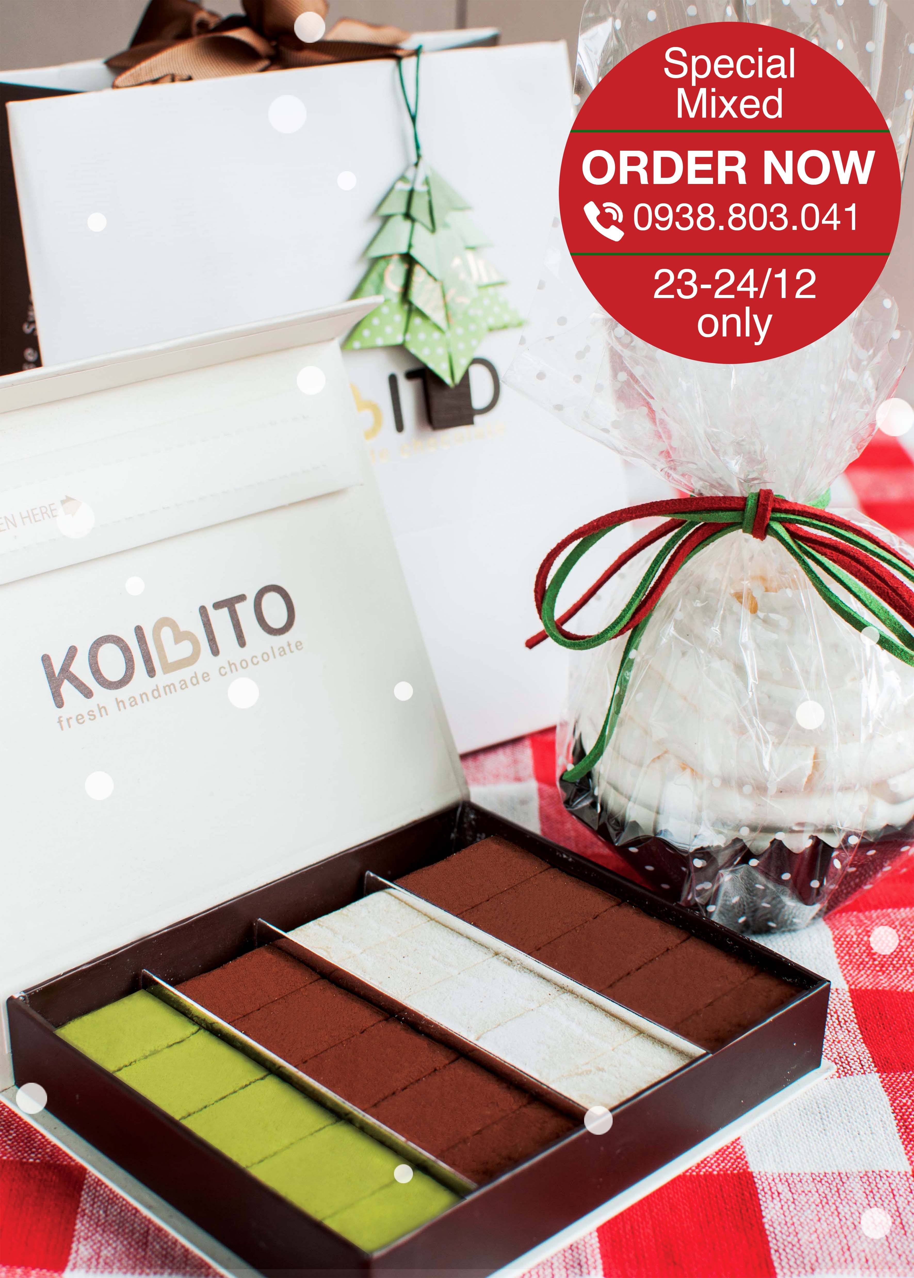Điều đặc biệt hơn nữa là KOIBITO vừa cho ra mắt hộp quà 4 vị special mixed tổng hợp 4 loại chocolate đang rất được ưa chuộng hiện nay: chocolate vị trà xanh matcha + chocolate sữa vị bạc hà morning mint + chocolate trắng vị vỏ cam, sả, bưởi + chocolate đen vị hoa hồng cùng túi quà chủ đề Giáng sinh xinh xắn.