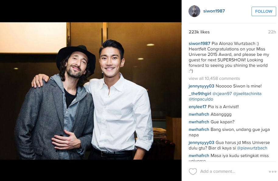 "Pia Alonzo Wurtzbach, chân thành chúc mừng bạn đăng quang Hoa hậu Hoàn vũ 2015 và làm ơn hãy làm khách của chúng tôi trong Supershow sắp tới! Mong chờ được thấy bạn tỏa sáng trên thế giới" - Choi Siwon viết trên trang Instagram cá nhân.