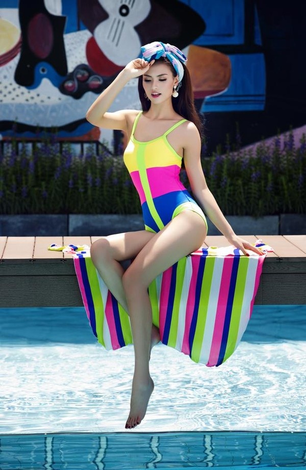 | Xu hướng màu neon vẫn chưa hạ nhiệt trong năm 2015. Với trào lưu màu sinh động, bạn gái trở nên hiện đại, cá tính. Trong ảnh, Hồng Quế hóa thân làm cô nàng thành thị với áo bơi pha màu sắc tương phản. |