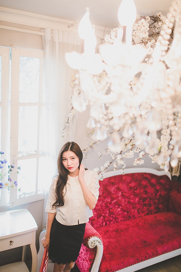 | Áo sơ mi cổ Peter Pan với phần ống tay ren mang lại sự dịu dàng nữ tính. |