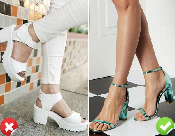 Sandals: Nếu tự ti với đôi chân thô của mình, bạn hãy chọn những đôi ankle strap sandals cực kỳ nữ tính và thanh mảnh. Những mẫu giày này sẽ giúp bạn phô diễn được nét nữ tính và duyên dáng và che đi nét thô kệch của đôi chân. Ngược lại, kiểu sandals chunky sẽ không hề ăn ý và làm mất đi nét quyến rũ của đôi chân. |