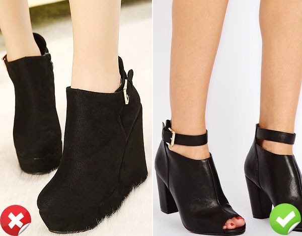 Bốt: Những đôi bốt hở mõm hay có quai ngang sẽ giúp bạn che đi được phần thô và khoe ra phần thon thả. Những kiểu bốt cut-out luôn là xu hướng lý tưởng mang đến sự duyên dáng cho mọi đôi chân. |