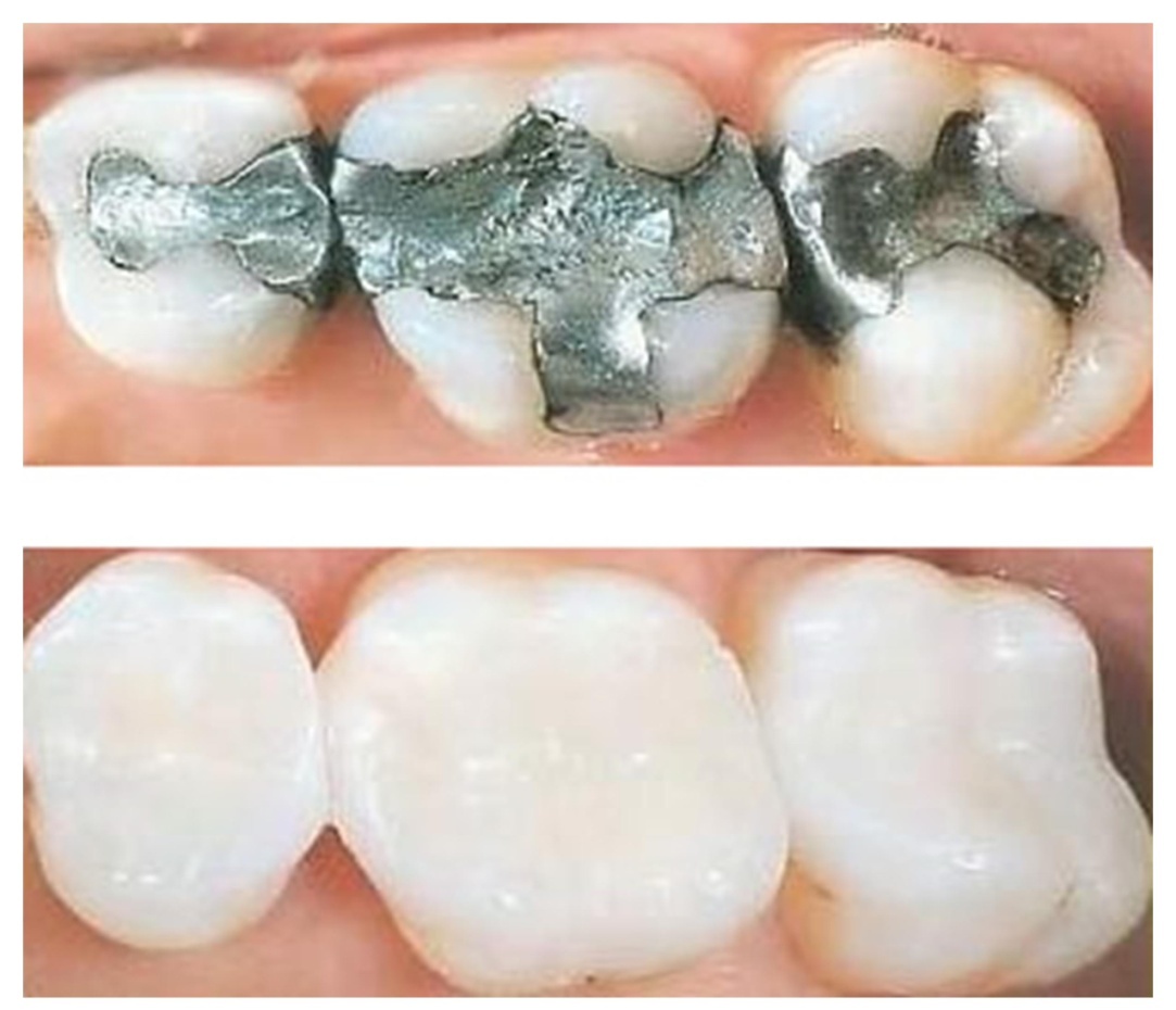 | Trám composite (dưới) so với trám bạc amalgam. |