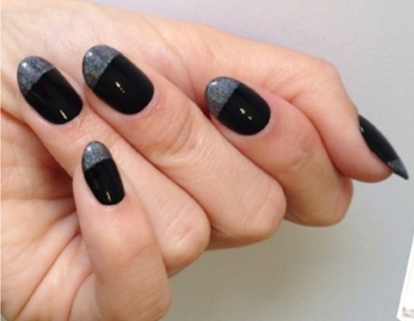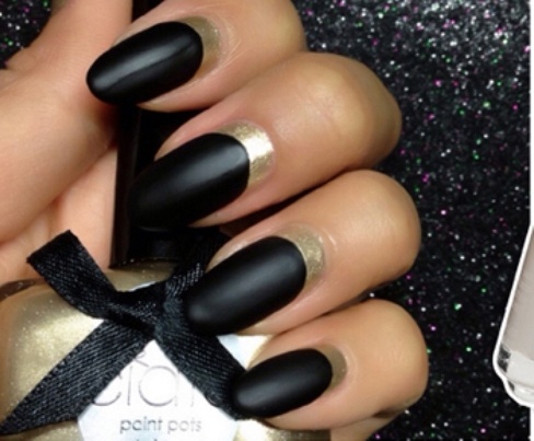 Lớp sơn mịn và mờ biến tấu với sơn vàng nhạt nhũ ánh cuối móng góp phần khẳng định phong cách cho những cô nàng cá tính. Ngoài ra, sắc đen không kén trang phục cũng như gu trang điểm nên bạn có thể mix đồ linh hoạt.